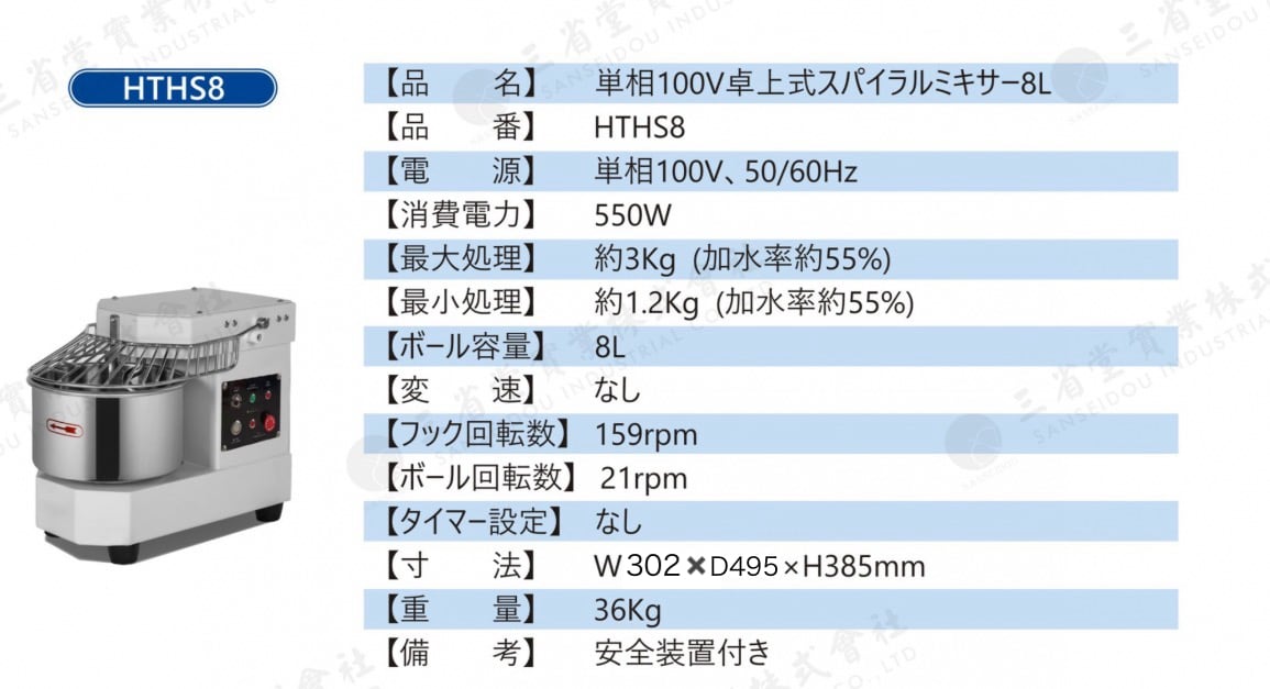 【100V電源】一定速 スパイラルミキサー8L / 単相100V / 生地作りに最適 送料無料 / 三省堂実業